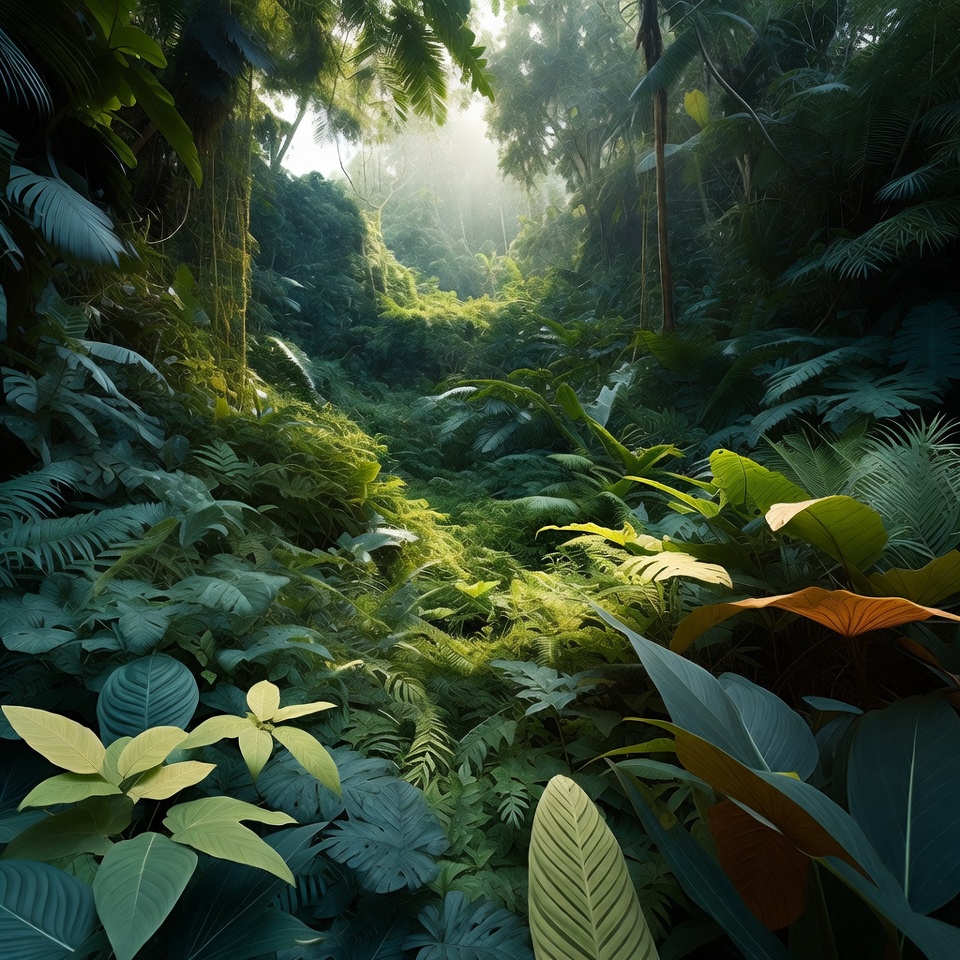 broad leaves, dense foliage, digital art, ferns, green plants, illustration, lush greenery, moss ground, nature scene, path trail, rainforest, sunlight rays, tall trees, tropical forest, vines, wilderness, yellow leaves, jungle
