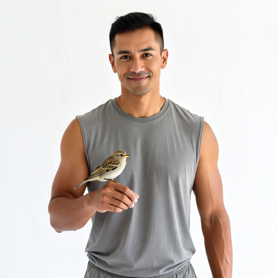 A muscular Asian man with short black hair smiles while gently holding a small sparrow on his finger. He wears a gray tank top and gray shorts, standing against a plain white background. The sparrow perches calmly with its wings slightly spread.