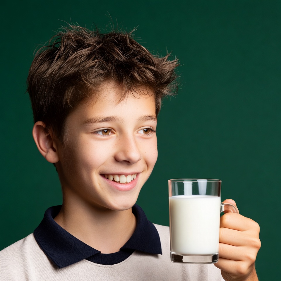 A young boy with short brown hair smiles while holding a clear glass of milk in his hand. He wears a light-colored shirt with a dark collar and stands against a solid green background. His expression is cheerful with eyes looking slightly to the side.