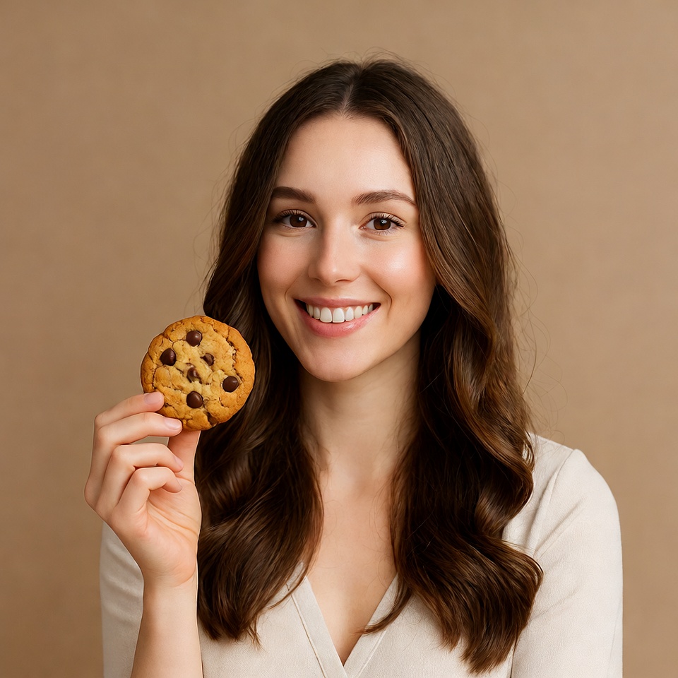 A young woman with long brown hair smiles while holding a large chocolate chip cookie in her hand. She wears a light-colored top and stands against a beige background. Her eyes are bright and she displays a happy expression.