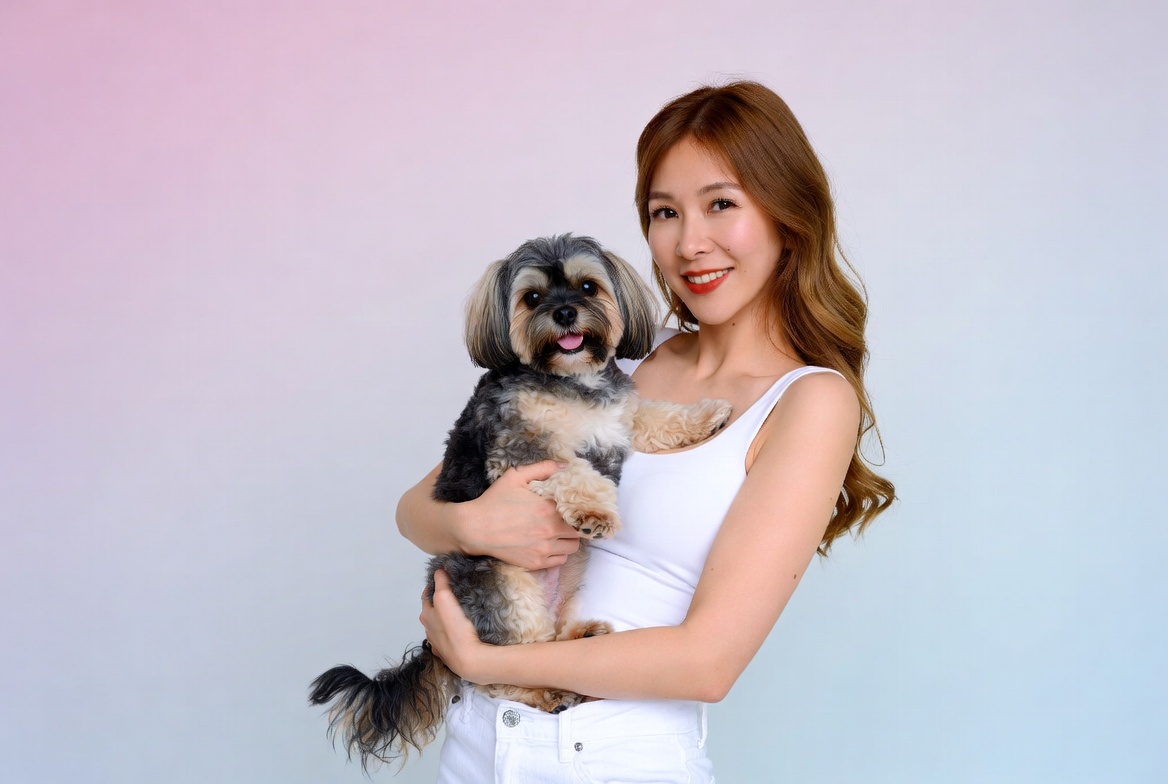 A smiling Asian woman with long wavy brown hair holds a small Yorkshire Terrier dog in her arms. She wears a white tank top and white pants, standing against a pastel pink and blue gradient background. The fluffy black and tan dog looks at the camera with its tongue out.