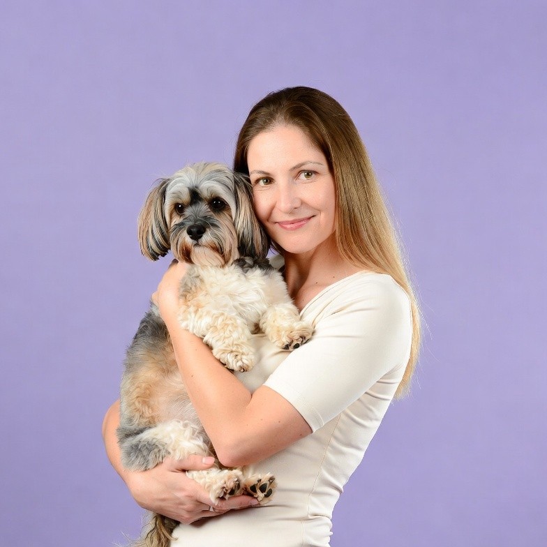 A woman with long brown hair smiles while holding a small Shih Tzu dog in her arms against a purple background. She wears a light beige short-sleeved top. The dog has a fluffy gray, white, and brown coat with dark eyes.