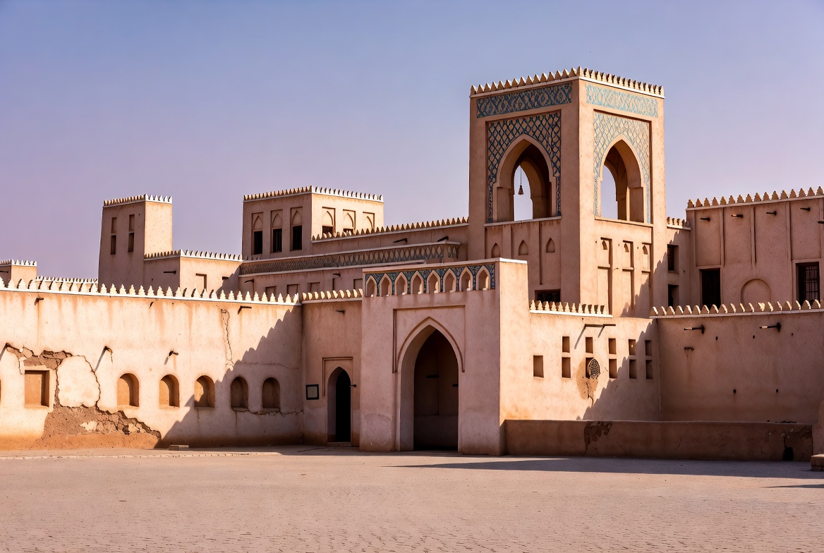 Islamic architecture, Middle Eastern fort, adobe walls, ancient building, arched doorway, beige walls, clear sky, courtyard, desert fort, geometric patterns, historic structure, minaret tower, narrow windows, sand ground, shadows, tilework, traditional architecture, mud brick fort