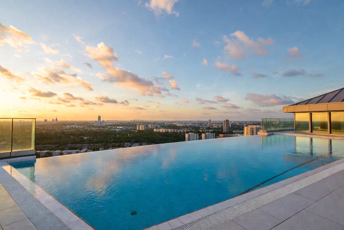 aerial view, blue water, buildings, city skyline, cityscape, clouds, dusk, glass railing, high-rise building, horizon, luxury pool, modern architecture, orange sky, pink sky, poolside, reflection, rooftop pool, sky, skyscrapers, sunset, swimming pool, tiled deck, urban view, infinity pool