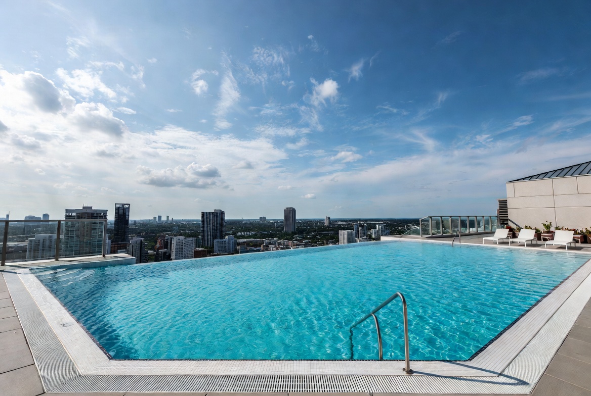 aerial view, blue sky, blue water, city skyline, cityscape, clear sky, clouds, glass railing, high rise, high-rise buildings, lounge chairs, luxury pool, modern architecture, outdoor pool, pool edge, poolside, rooftop pool, rooftop terrace, skyscrapers, sunny day, swimming pool, terrace, urban view, infinity pool