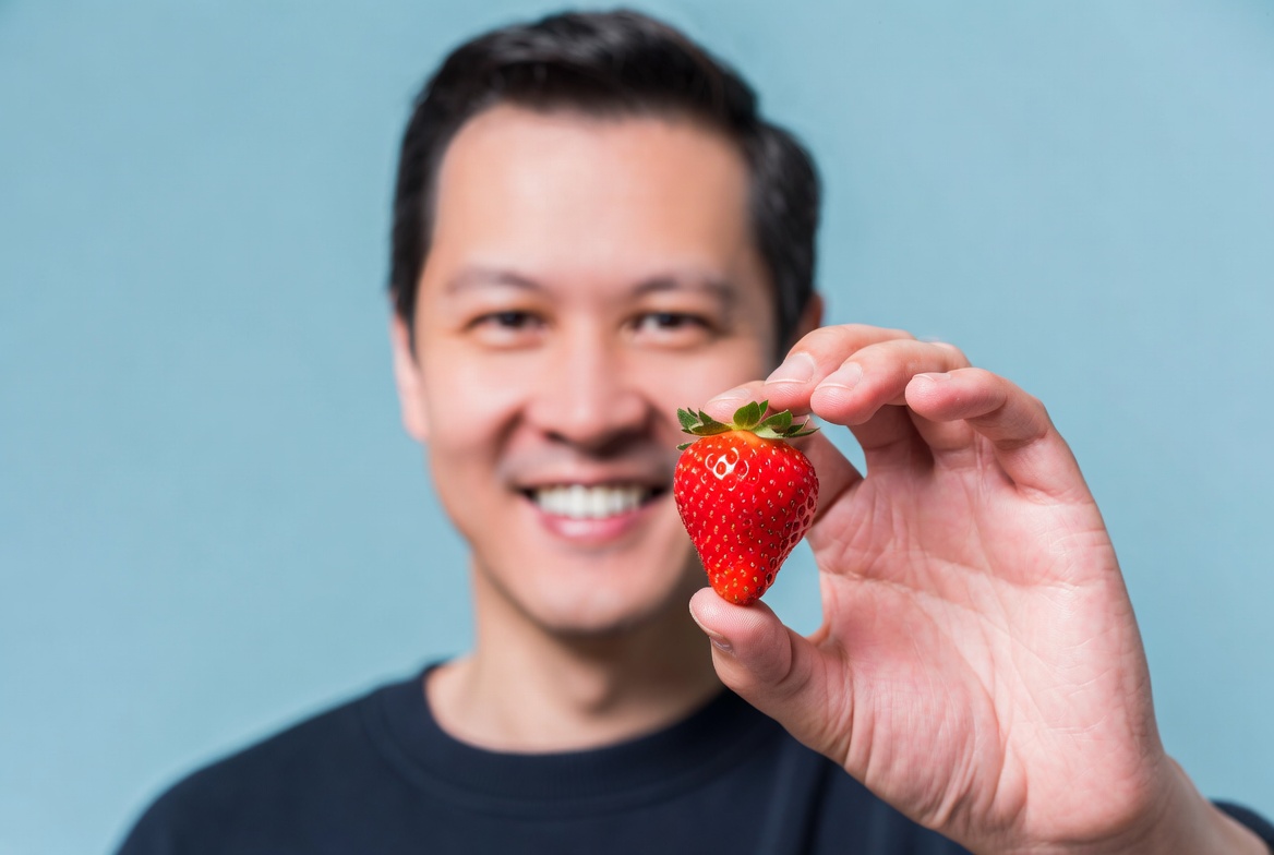 A smiling Asian man with short black hair holds a fresh red strawberry between his thumb and forefinger. He wears a dark shirt and stands against a blue background with the strawberry in sharp focus. His face is slightly blurred in the foreground.