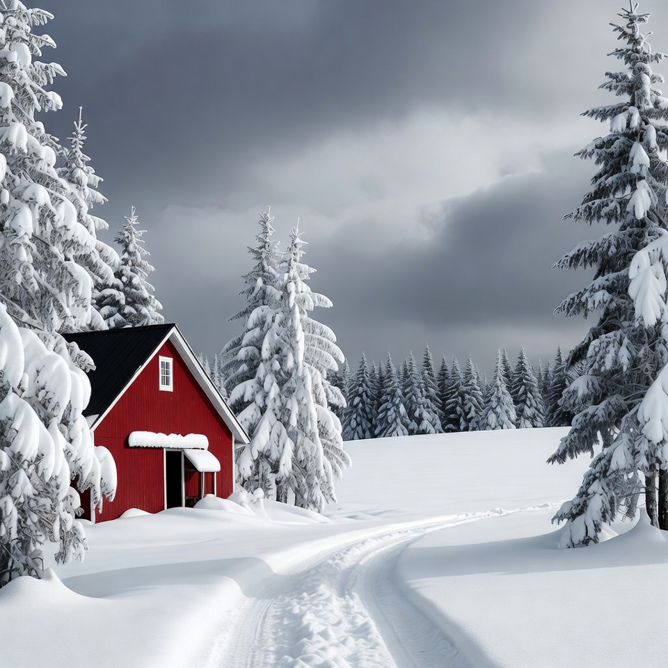 A vibrant red barn with a black roof stands in a snowy landscape surrounded by snow-covered pine trees. A snowy path leads toward the barn under a cloudy gray sky. The scene features deep snowdrifts and evergreen trees framing the rustic structure.