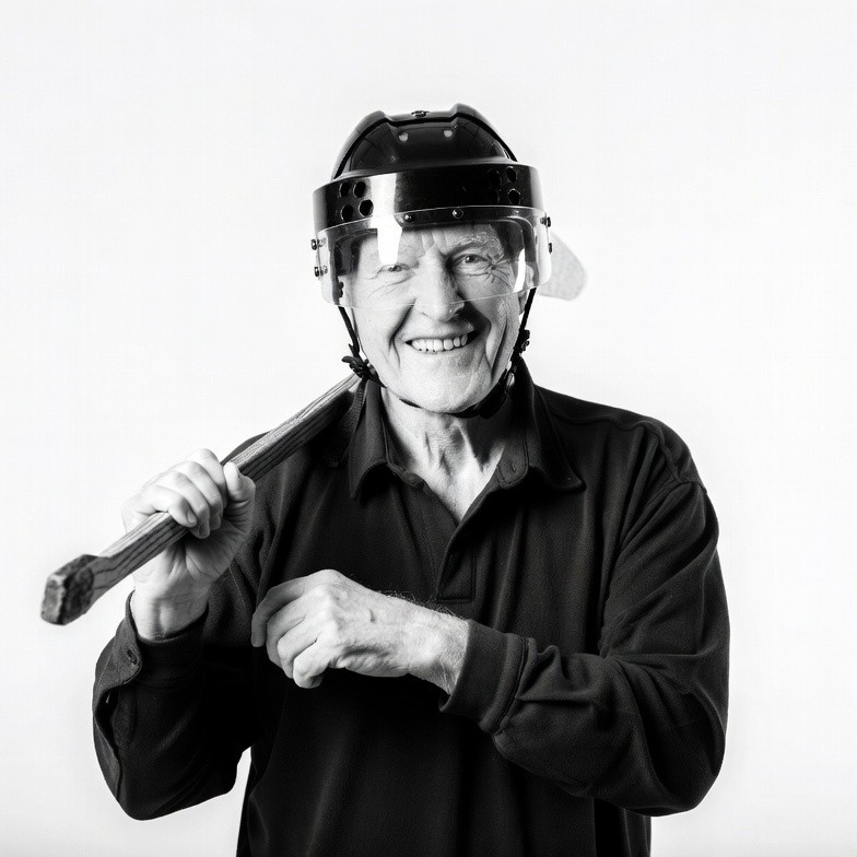 An elderly White man with glasses smiles broadly while wearing a black hockey helmet with a clear face shield. He holds a wooden hockey stick in his right hand and stands against a white background. He wears a dark polo shirt and poses confidently.