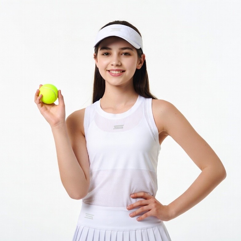 Asian, athlete, confident pose, female, holding tennis ball, isolated background, long hair, smiling, sports clothing, sportswear, tennis, tennis ball, tennis player, tennis skirt, white tank top, white visor, young girl, girl