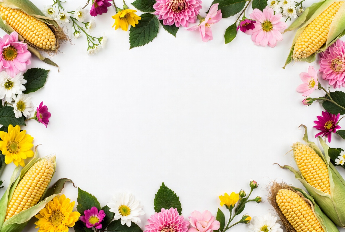 A circular border of fresh corn cobs and colorful flowers surrounds a blank white space in the center. Pink dahlias, yellow sunflowers, white daisies, and green leaves frame the composition. The arrangement is flat lay style on a white background.