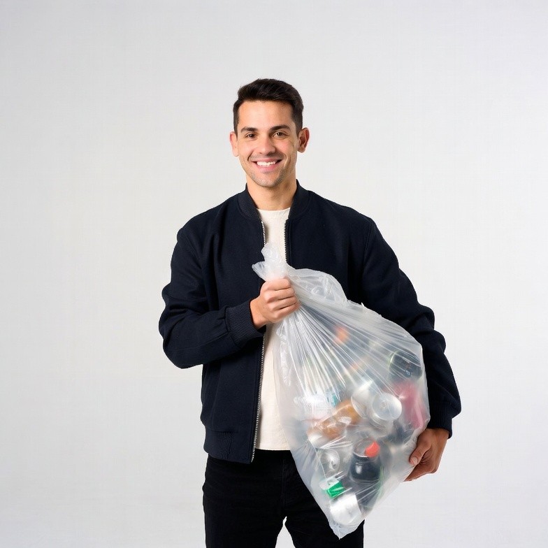 A smiling young man with short dark hair stands against a white background, holding a large clear plastic trash bag filled with assorted cans and bottles. He wears a black bomber jacket over a white shirt and black pants. The bag is gripped in his right hand and hangs heavily.