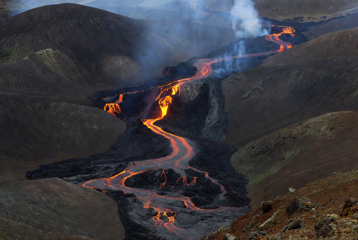 ash cloud, dark rocks, earth science, eruption, eruption site, fissure vent, flowing lava, geology, glowing magma, green patches, hot lava, lava stream, magma flow, molten lava, mountainside, natural disaster, orange lava, rocky terrain, rugged slopes, smoke plume, volcanic activity, volcanic landscape, volcanic mountains, volcano, lava