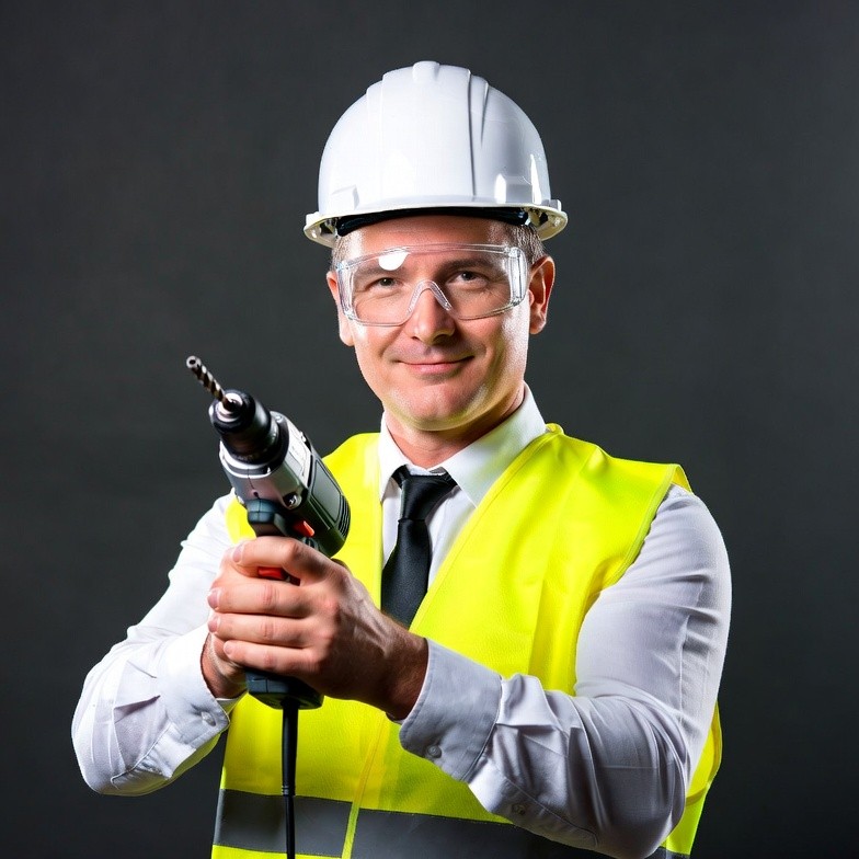 White, confident, construction, drill, drilling, hands holding, hard hat, high visibility vest, isolated background, male, middle-aged, portrait, power drill, professional, safety gear, safety goggles, safety helmet, smiling, tie, tools, white shirt, worker, yellow vest, man