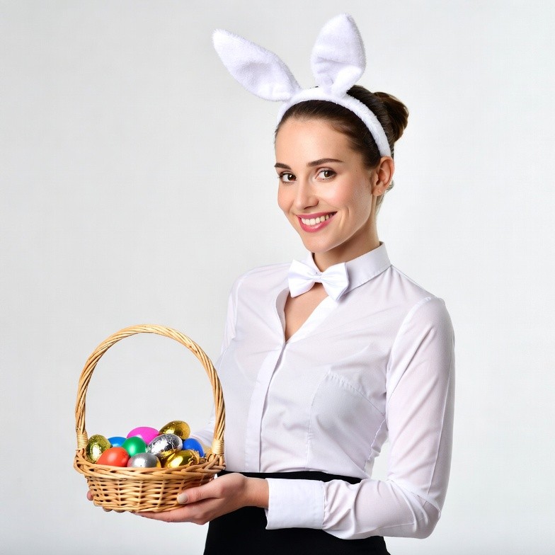 A smiling woman with white bunny ears headband and brunette hair in a bun holds a woven basket filled with colorful Easter eggs. She wears a white collared shirt with black bow tie and black skirt, standing against a plain white background. Her expression is cheerful as she presents the basket forward.