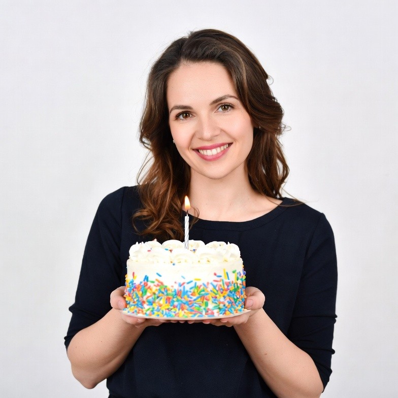 A smiling woman with long brown wavy hair holds a small white birthday cake topped with colorful sprinkles and a single lit candle. She wears a black top and stands against a plain white background. Her expression is joyful as she presents the cake forward.