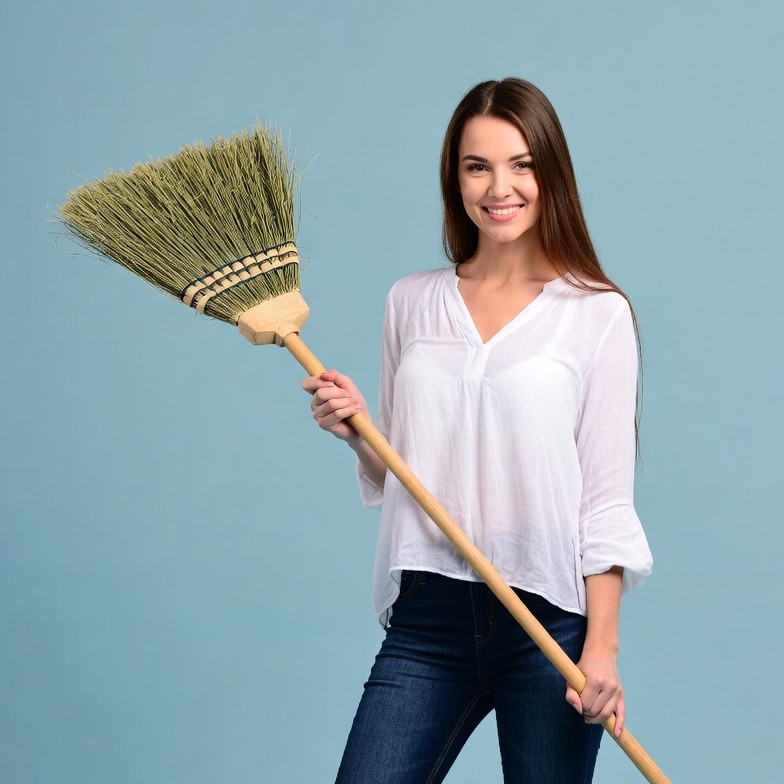 A smiling woman with long brown hair holds a large straw broom in her hands against a blue background. She wears a white blouse with a V-neck and blue jeans. She stands confidently while gripping the wooden handle of the broom.