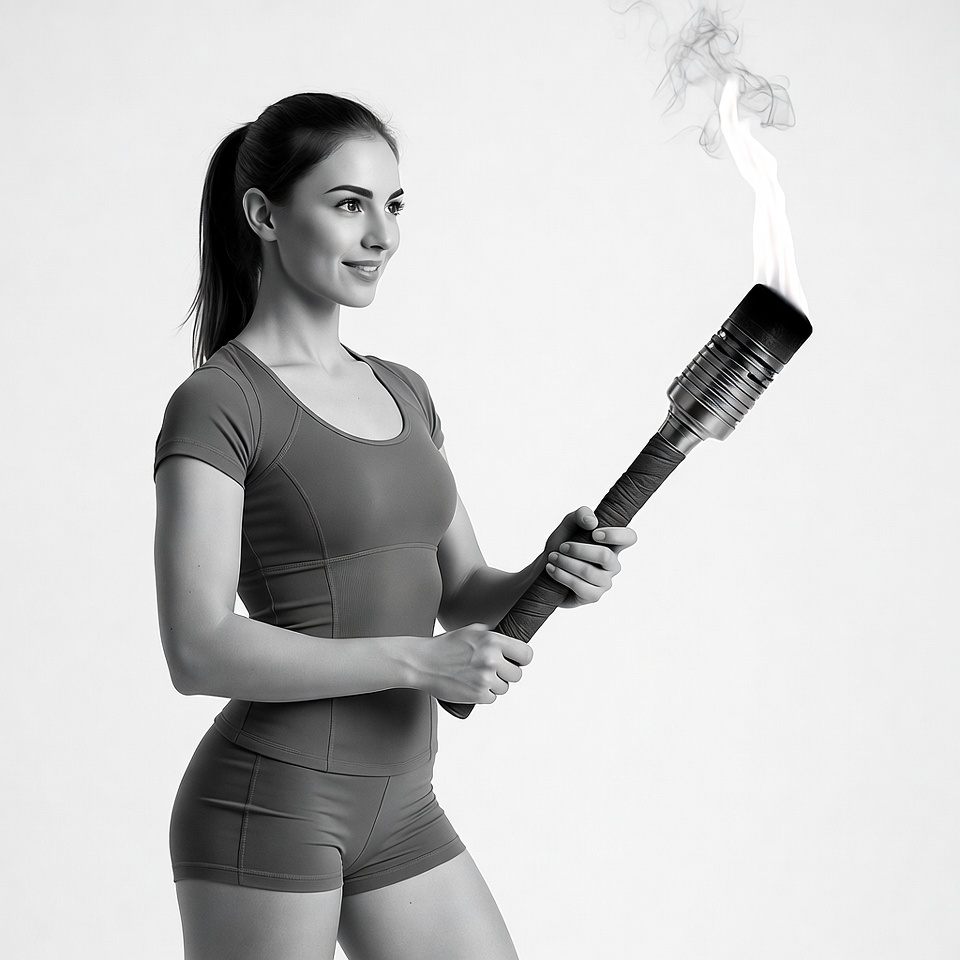 Olympic torch, White, athletic, black and white, female, fire, fit, flame, holding torch, isolated background, ponytail, profile view, shorts, smiling, smoke, sportswoman, tight top, torch, woman