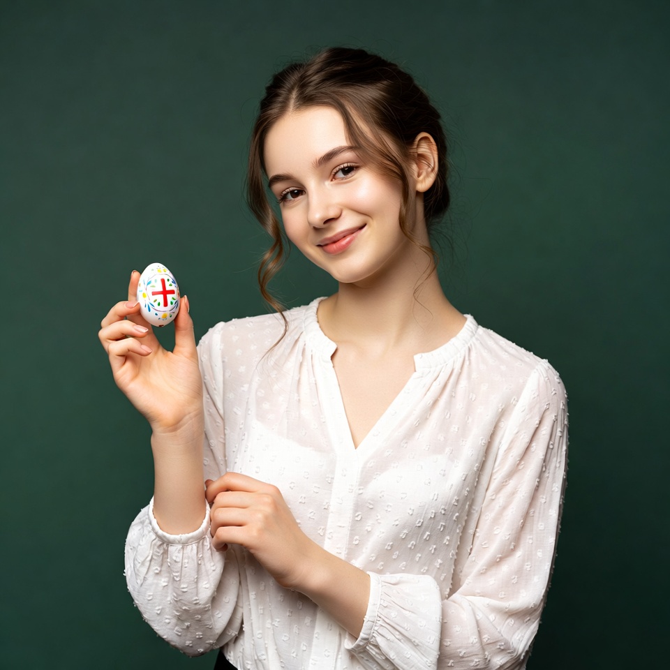 A young woman with brown hair styled in a ponytail smiles while holding up a white Easter egg painted with a red cross on a green background. She wears a white blouse with long sleeves and stands confidently with one hand near her collar. The egg is detailed with colorful patterns and held gently in her right hand.