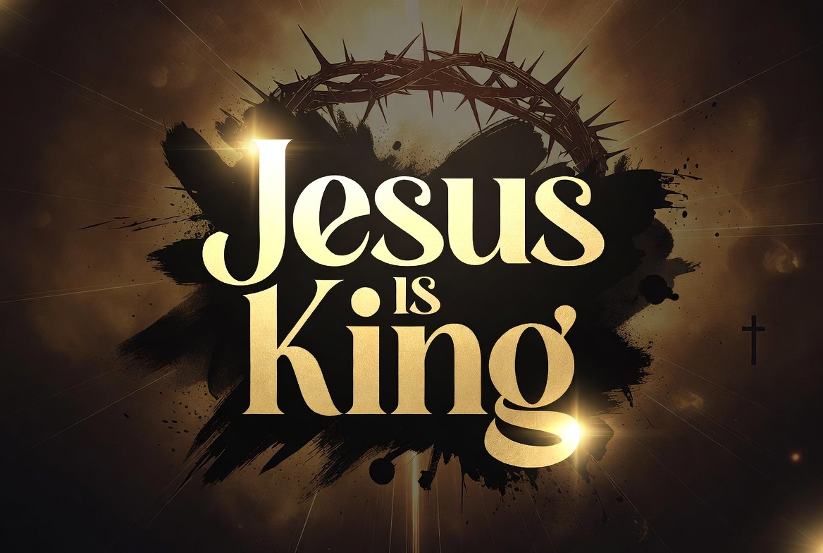 A dramatic graphic design features the bold golden text 'Jesus is King' centered on a dark background. A glowing crown of thorns encircles the text, with radiant light effects and subtle cross symbol. Splattered paint accents enhance the artistic, religious theme.