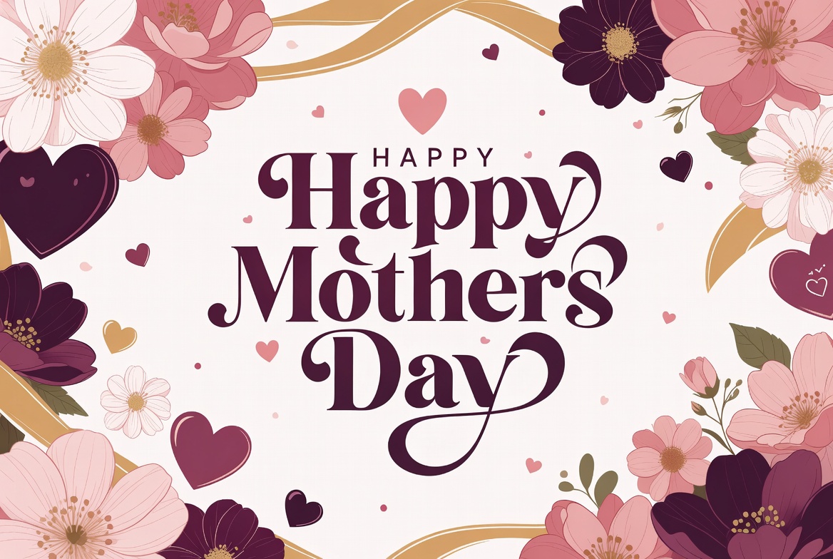 A vibrant illustration features the text 'Happy Mothers Day' in elegant pink and purple cursive font. It is surrounded by clusters of pink, white, and maroon flowers and scattered red hearts on a light pink background. Gold ribbons frame the design.