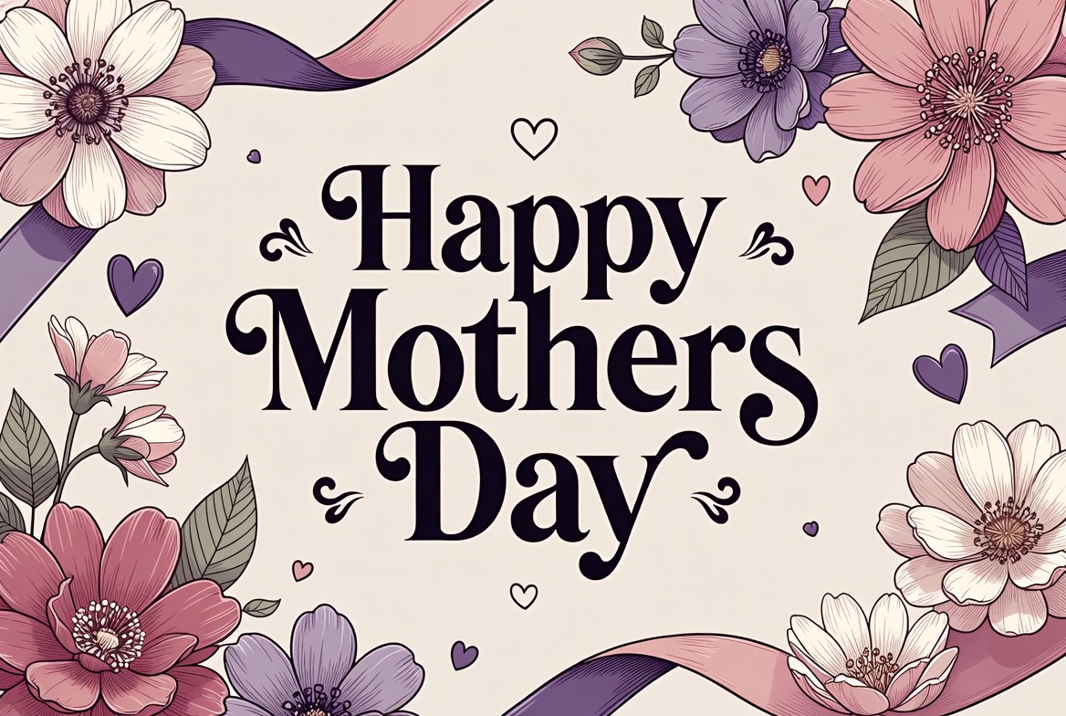 beige background, buds, clipart, cursive text, festive, floral design, flowers, greeting card, happy mothers day, hearts, holiday graphic, illustration, leaves, pink flowers, purple flowers, ribbons, white flowers, mothers day