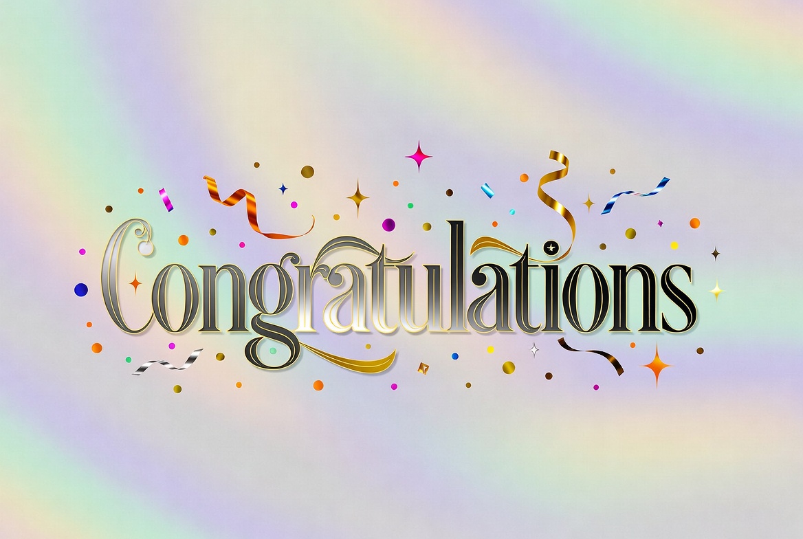 achievement, award, banner, celebration, confetti, digital art, festive, foil effect, gold, gradient, holographic background, illustration, multicolored, party, ribbons, shiny, sparkles, stars, text, congratulations