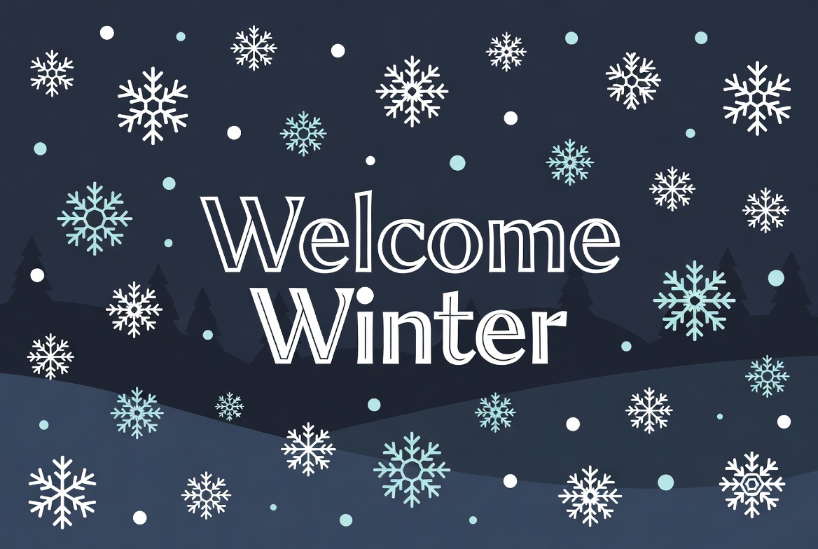A clipart illustration features the text 'Welcome Winter' in large white letters on a dark blue background. Scattered white and light blue snowflakes surround the text, with subtle snowy hills and pine trees at the bottom. The design has a festive winter theme with an isolated background.