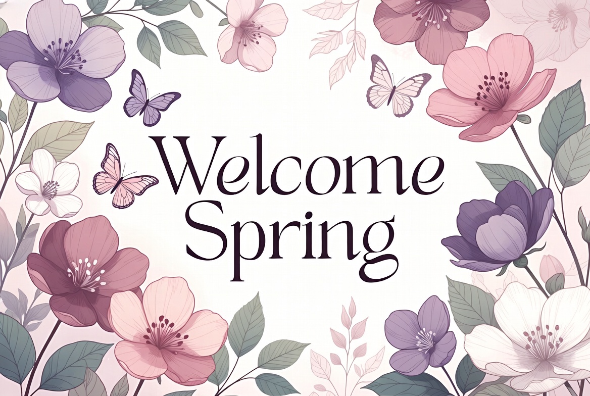 A vibrant digital illustration features the text 'Welcome Spring' in elegant cursive font centered on a white background. Surrounding the text are clusters of pink, purple, and white flowers with green leaves and delicate butterflies. The design uses soft pastel colors for a fresh, springtime theme.