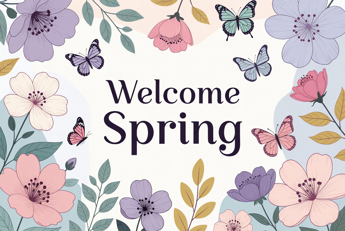 A colorful digital illustration features the text 'Welcome Spring' centered on a white background. Surrounding the text are various purple, pink, and white flowers, green leaves, and blue butterflies. The design uses soft pastel colors and whimsical shapes.