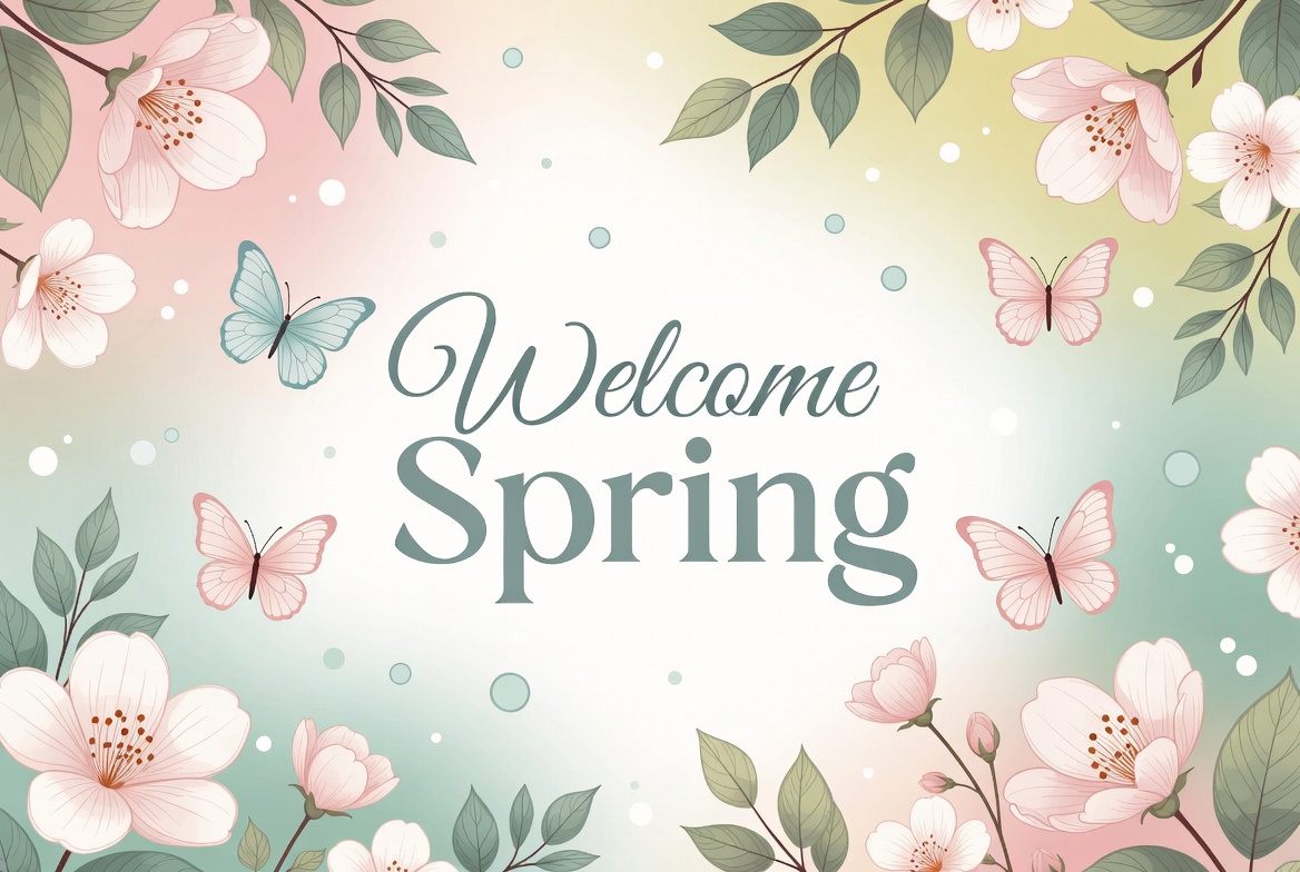 blossom branches, blue butterfly, butterflies, cherry blossoms, clipart, cursive font, digital art, elegant text, floral design, gradient background, green leaves, isolated background, nature graphic, pastel background, pink butterfly, pink flowers, soft bubbles, spring greeting, spring illustration, white flowers, welcome spring