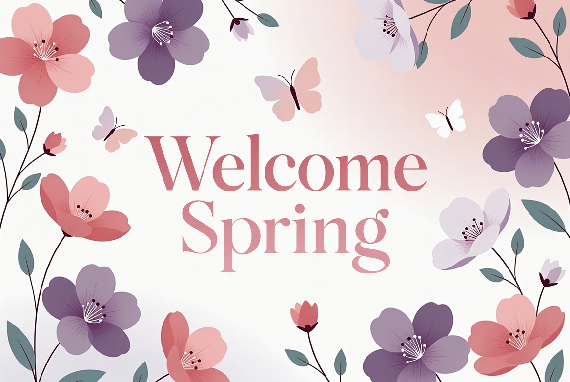 blooming flowers, butterflies, butterfly, clipart, cursive font, digital art, elegant text, floral, flower arrangement, flowers, green leaves, illustration, isolated background, leaves, nature design, pastel colors, pink flowers, pink gradient, purple flowers, seasonal greeting, spring, spring greeting, vector art, white background, welcome spring
