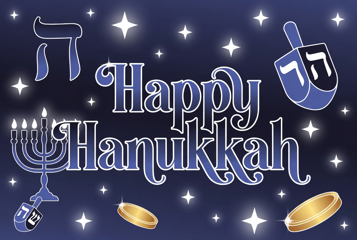 A vibrant blue illustration features the words 'Happy Hanukkah' in large white and blue letters. It includes a menorah with lit candles, a dreidel, gold coins, Hebrew text, and sparkling stars on a dark blue background.