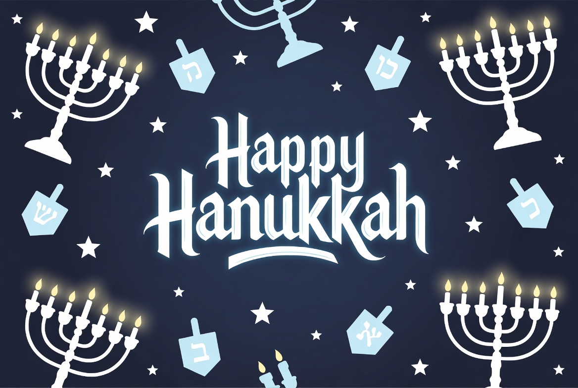 A festive Hanukkah illustration features large white text reading 'Happy Hanukkah' on a dark blue background. Multiple white menorahs with lit candles and blue dreidels are scattered around the text. White stars and glowing candle flames add a celebratory touch.