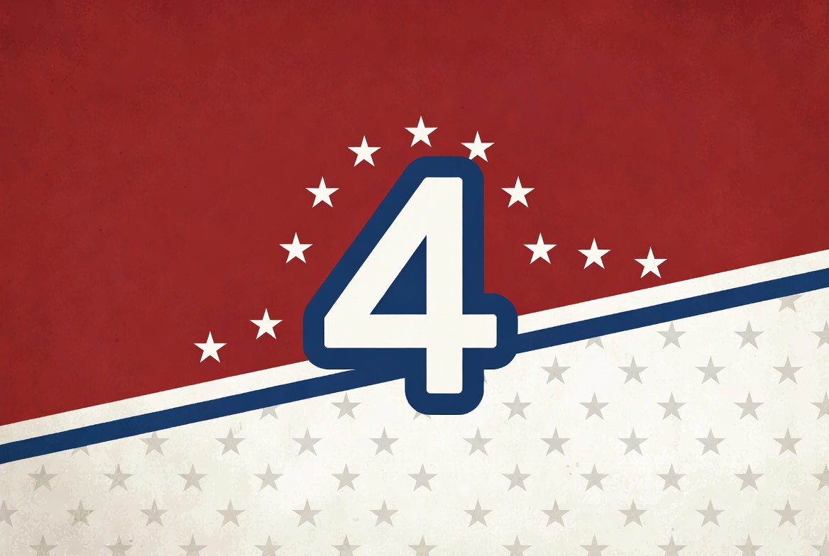 A large white number 4 outlined in navy blue sits prominently on a deep red background. Golden stars surround the top of the number, with additional stars scattered around. A diagonal navy stripe and white star pattern appear in the lower section.