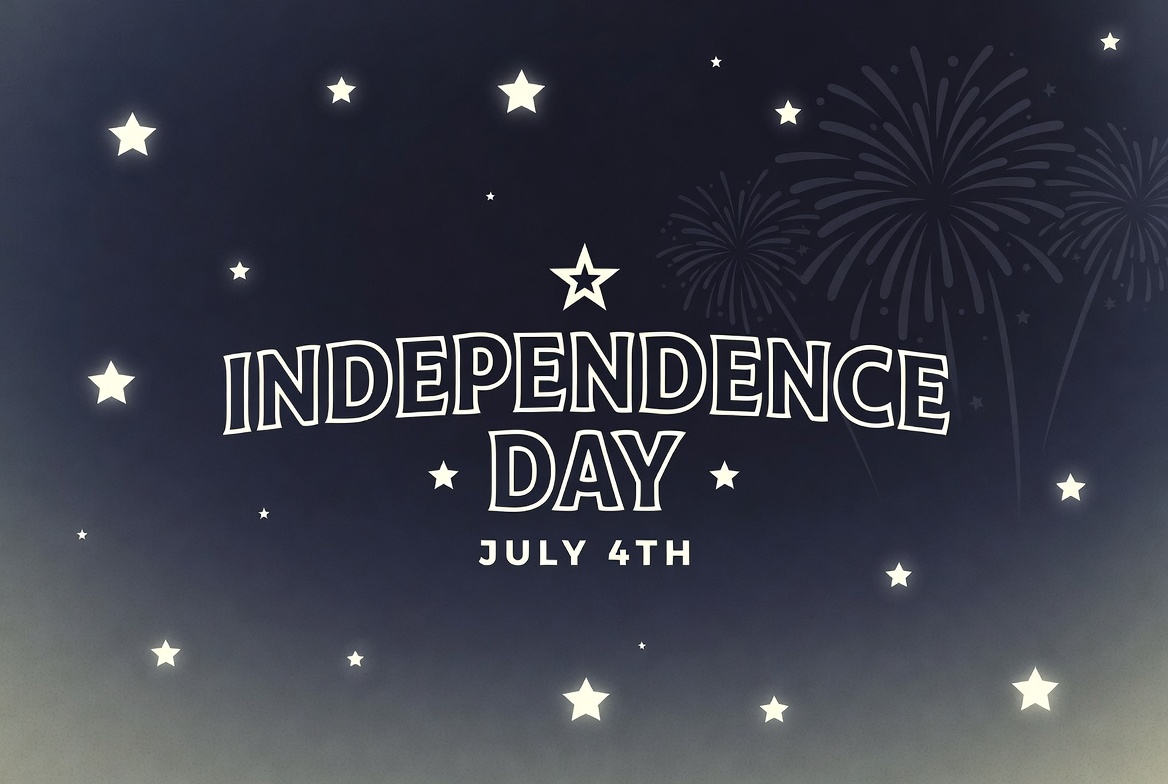 American holiday, Fourth of July, July 4th, celebration, dark background, festive design, fireworks, gradient background, holiday graphic, night sky, patriotic, sparkling stars, stars, text overlay, Independence Day