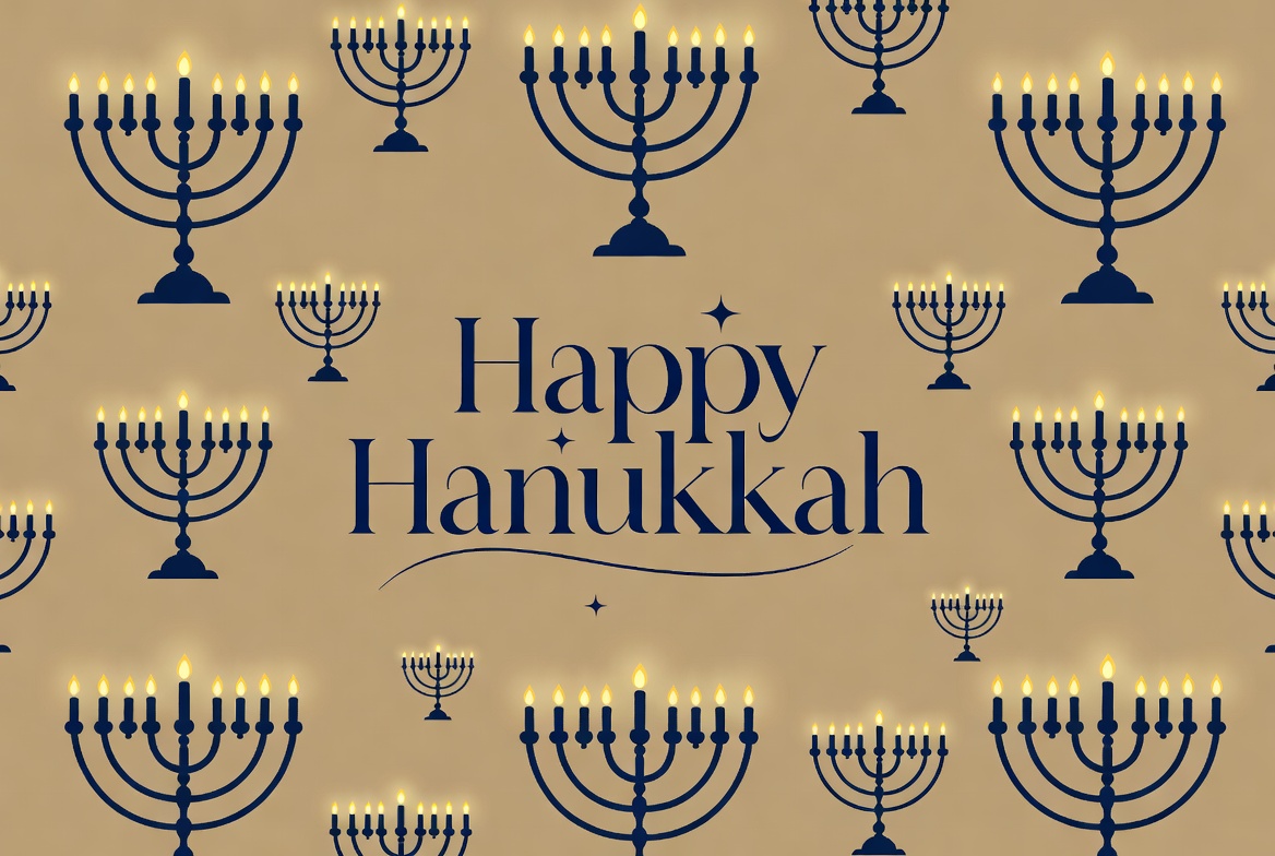 A festive illustration features the text 'Happy Hanukkah' in elegant blue script on a beige background. Multiple lit menorahs with blue candles are scattered throughout the design. The graphic style is simple and celebratory for the Jewish holiday.
