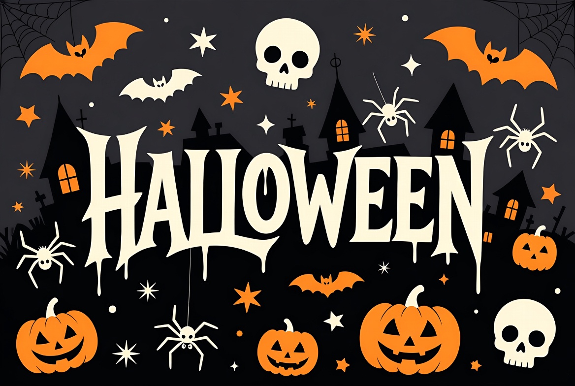 A vibrant Halloween illustration features the bold word 'Halloween' in white gothic letters on a dark background. Surrounding elements include orange pumpkins, flying bats, spiders, skulls, haunted houses, and white stars. The design uses contrasting orange, white, and black colors for a festive spooky effect.