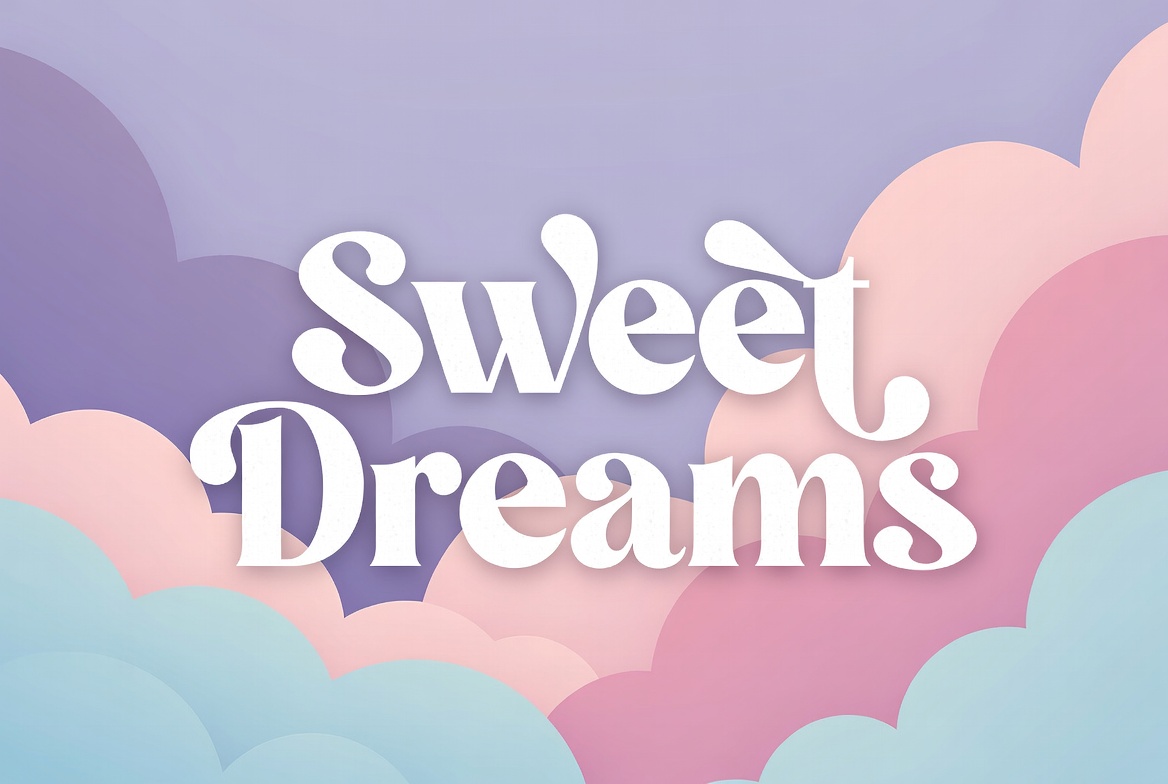 A digital illustration features the phrase 'Sweet Dreams' in large, elegant white cursive font. It is set against a dreamy background of soft purple, pink, and blue pastel clouds. The design has a whimsical, gradient sky appearance.
