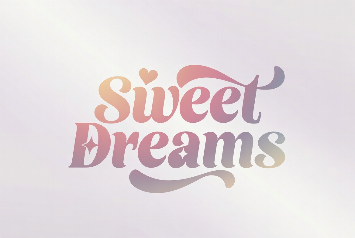A colorful graphic illustration features the phrase 'Sweet Dreams' in elegant, flowing script font. The text displays a gradient from pink to purple hues with subtle shine effects. It is set against a plain white background.