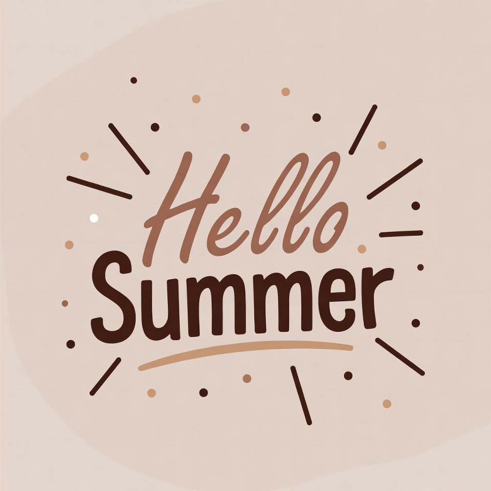 A vibrant illustration features the words 'Hello Summer' in bold, handwritten brown font on a light beige background. Radiating lines and scattered dots surround the text, adding a playful and summery burst effect.