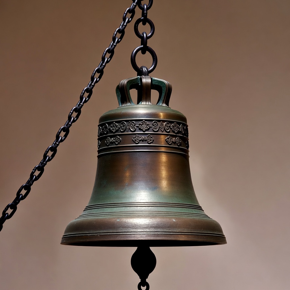 A large bronze church bell with intricate engravings hangs from thick black chains. The bell features a decorative crown top and detailed filigree patterns around its body. It is suspended against a neutral beige background.