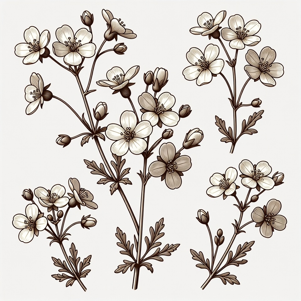 beige tones, botanical art, brown outlines, clipart, delicate flowers, floral illustration, flower buds, flowers, hand drawn flowers, illustration, isolated background, leaves, line art, nature drawing, small petals, stems, thin stems, vector flowers, white flowers