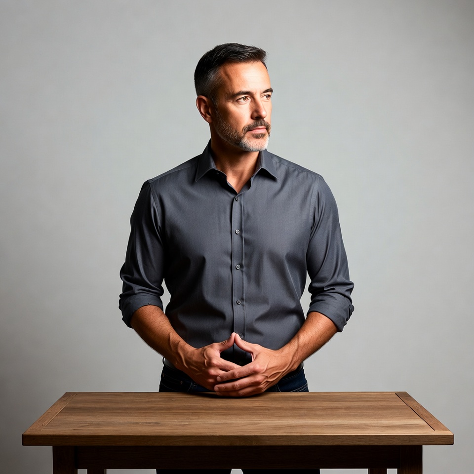 A mature man with short dark hair, a goatee beard, and thoughtful expression stands in front of a wooden table. He wears a gray button-up shirt with rolled sleeves and has his hands clasped together at waist level. He poses against a plain gray background.