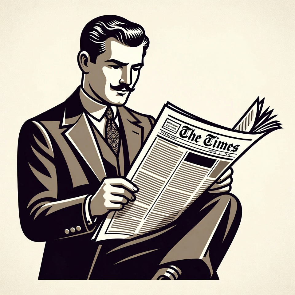 A man in a vintage suit and tie sits reading a newspaper titled The Times. He has neatly combed hair and a mustache, depicted in a black and white line art illustration style. The image features bold outlines and shading on an isolated background.
