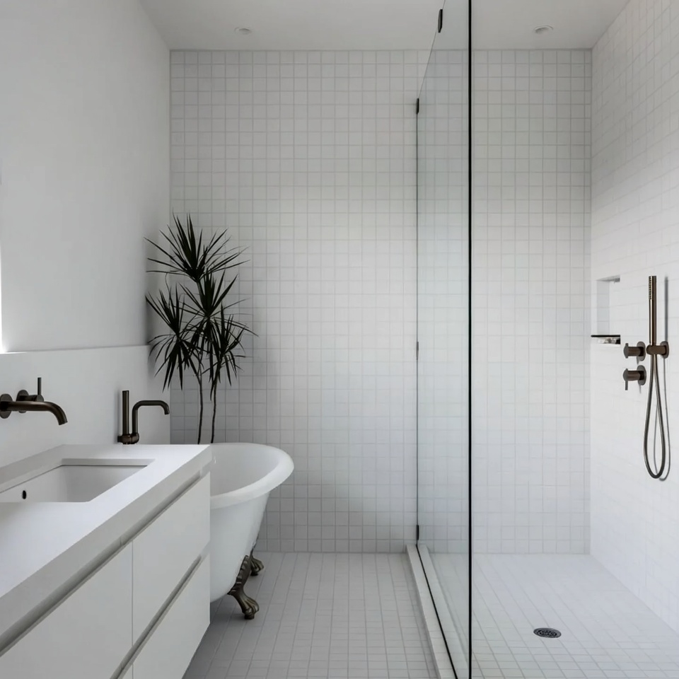 bathtub, bronze faucet, clawfoot tub, clean bathroom, glass shower, home decor, interior design, luxury bathroom, minimalist bathroom, modern bathroom, palm plant, potted plant, shower enclosure, spa bathroom, subway tiles, vanity, vessel sink, white bathroom, white tiles, bathroom