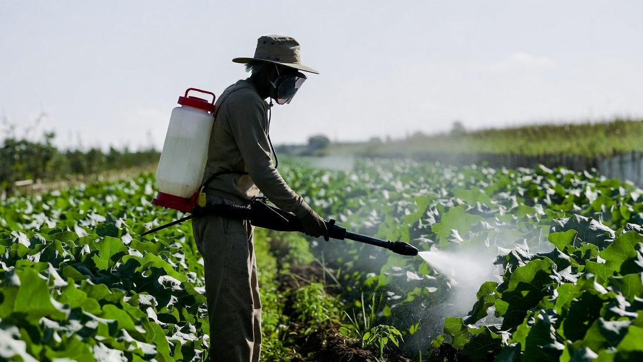 Farmer spraying pesticides on crops