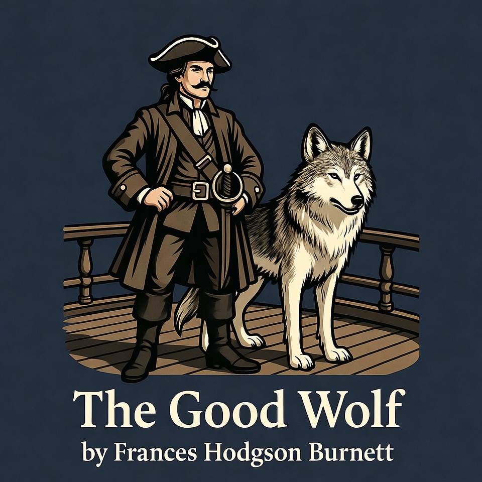 An illustration depicts a pirate man in a tricorn hat, brown coat, and boots standing confidently on a wooden ship deck railing. A gray wolf stands beside him, both rendered in a bold graphic style against a dark blue background. The image features the title 'The Good Wolf' by Frances Hodgson Burnett below.