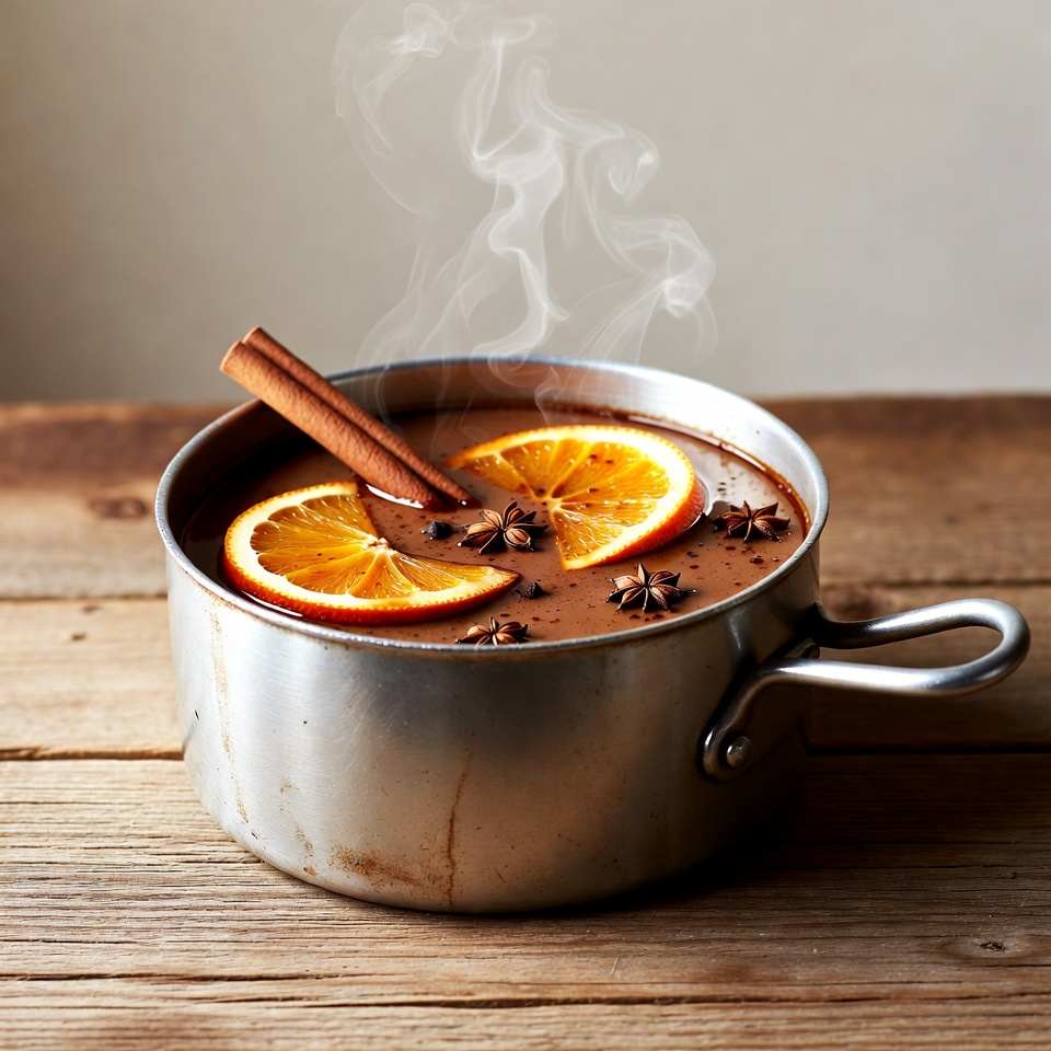 A steaming pot of mulled wine sits on a wooden table, garnished with orange slices, cloves, and a cinnamon stick. Wisps of steam rise from the dark reddish-brown liquid in the silver pot. Fresh orange segments and spices float on the surface.