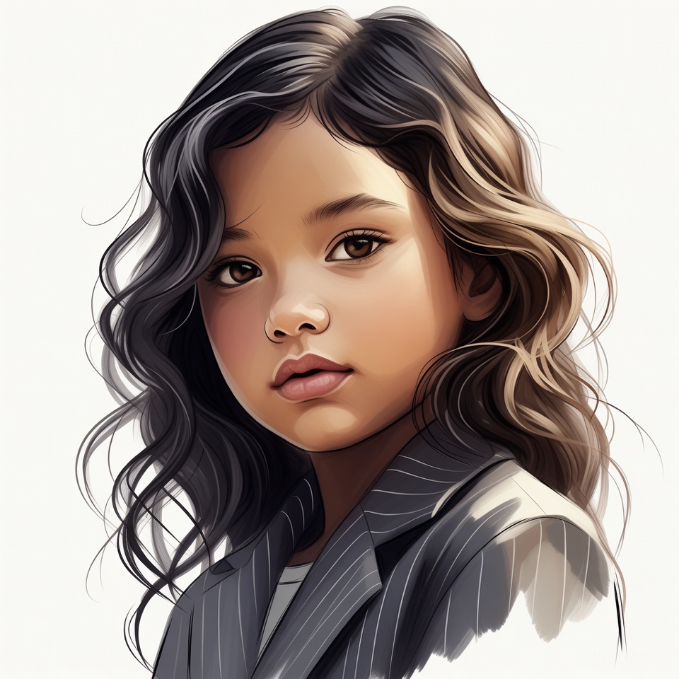 A young Asian girl with long wavy dark brown hair gazes forward with large expressive eyes. She wears a white shirt under a gray pinstripe blazer. The digital illustration is set against a white background.