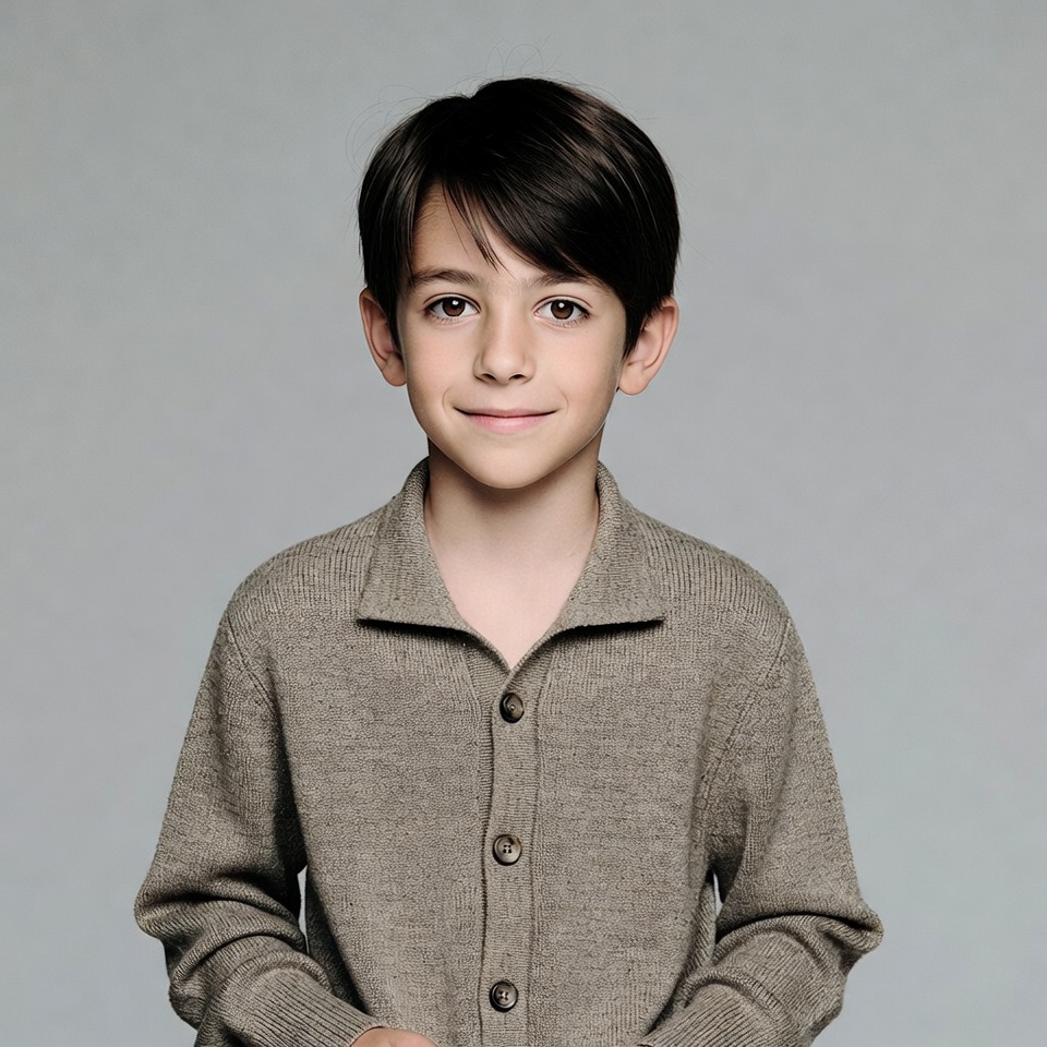 A young boy with short dark brown hair smiles at the camera against a plain gray background. He wears a light brown button-up sweater with long sleeves. His expression is friendly and he stands frontally.